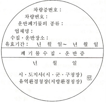 가. 폐기물을 수집·운반하는 자는 다음의 어느 하나에 해당하는 경우 폐기물을 수집·운반하는 차량(철도차량과 선박을 포함한다. 이하 이 호에서 같다)에 다음의 폐기물수집·운반증을 붙여야 한다, 다만, 폐기물을 철도차량이나 선박으로 운반하는 경우에는 폐기물수집·운반증을 가지고 있어야 한다.