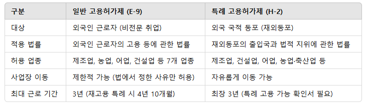 📌 E-9 비자 vs H-2 비자 (일반 고용허가제 vs 특례 고용허가제)